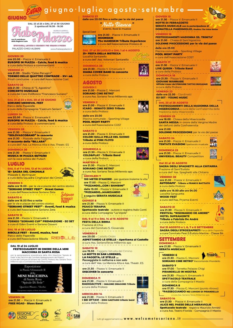 Altro punto forte del programma dell'estate sorianese sarà rappresentato dagli eventi dedicati alla cultura: dall'arte al cinema, passando per il teatro. Iniziative che raccolgono, ogni volta, il consenso del pubblico. Grande attesa per gli eventi dedicati a Luigi Pirandello e alla Mini Macchina di Santa Rosa, quartiere Pilastro, con Spirale di Fede che sarà esposta in piazza Vittorio Emanuele II, un atto per sottolineare il forte legame tra la giovane patrona viterbese e Soriano, dove si rifugiò, già cagionevole di salute, esiliata dal podestà per ordine di Federico II.