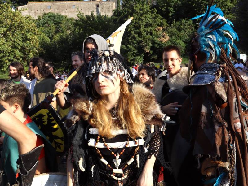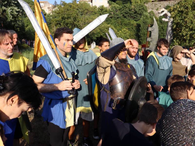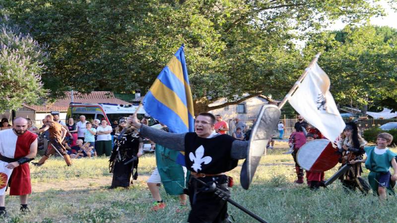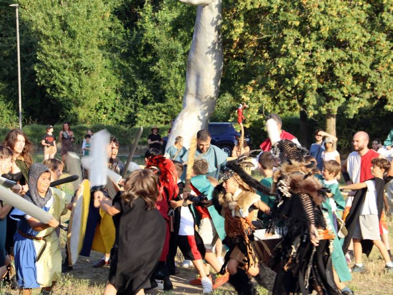 In attesa di riconquistare, magari, quello spazio fuori le mura che rafforza ancora di più il concetto di battaglia per difendere la città, è stato il parco che ospita la scultura del Risveglio ad ospitare anche quest’anno la battaglia, iniziata con quella dei bambini, che si allenano per giorni per creare scudi e spade e assaporare il gusto della storia, seguita dallo scontro tra campioni, dalle schermaglie verbali e dalla battagliola finale. Per la verità quest’anno i bambini sono stati davvero protagonisti: coinvolti nel lato dei guelfi e proseguire il gioco, sono riusciti a strappare lo stendardo consegnandolo al generale ghibellino, che nel frattempo era intento a combattere al centro. Un pizzico di astuzia, forse, ma anche l’insegnamento che la storia concede sempre occasioni, che vanno colte al volo.