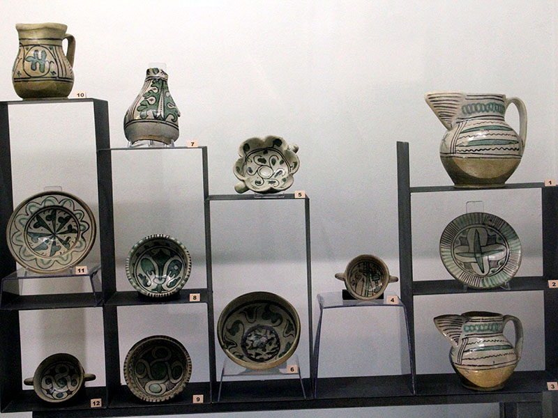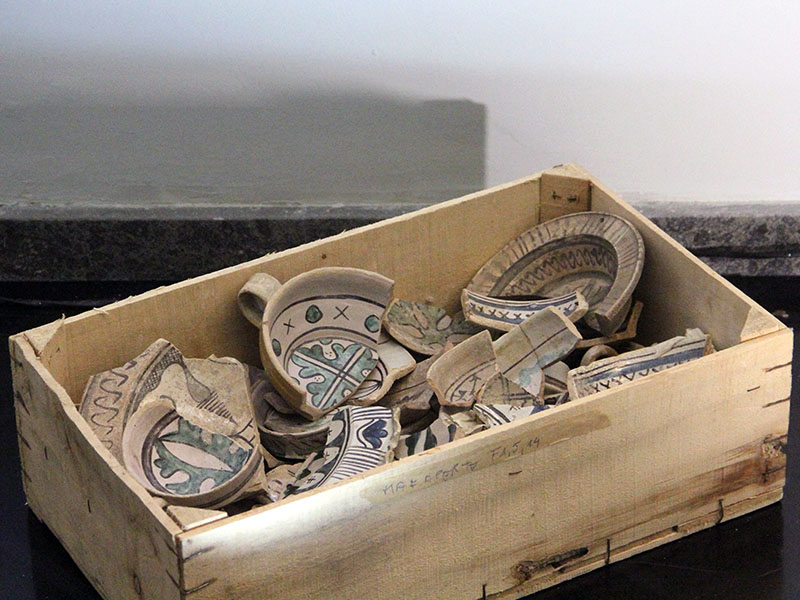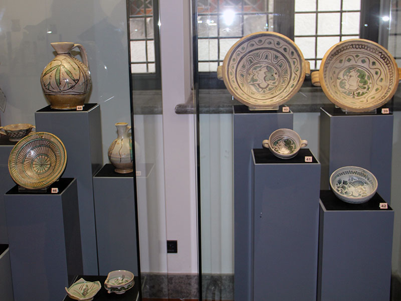 I reperti restaurati e messi in mostra sono tutti dipinti in verde ramina e bruno di manganese, con decori a motivi geometrici, fitomorfi e talvolta riproducono stemmi e simboli sacri. Del lotto fa parte un ridottissimo numero di frammenti di zaffera a rilievo ed alcuni piatti e ciotole in monocromia azzurra, databili intorno alla metà del XV secolo, e un frammento di zaffera con rarissima decorazione blu e gialla.