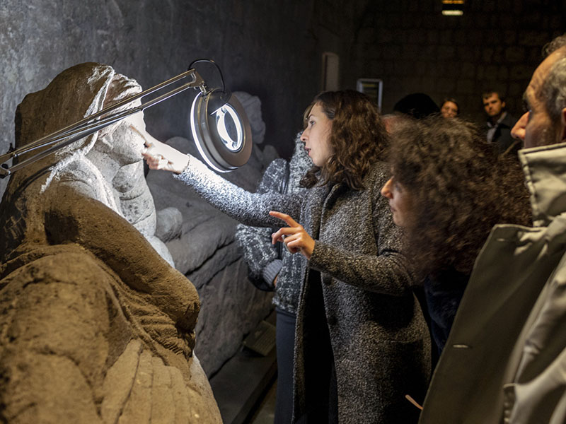 Al centro dell'attenzione un aspetto poco noto: il colore delle sculture. La maggior parte dei sarcofagi, infatti, mostra tracce di una cromia originaria, composta soprattutto dei toni del rosso e del giallo.
