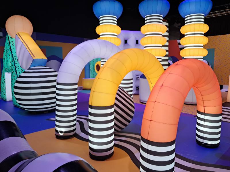 Diviso idealmente tra arte e parco di divertimento, il percorso della mostra è adatto ad ogni età, ammirando installazioni fuori scala e opere d’arte gonfiabili di rinomati artisti contemporanei internazionali che declinano il tema dell’aria ispirati da meraviglia e divertimento.