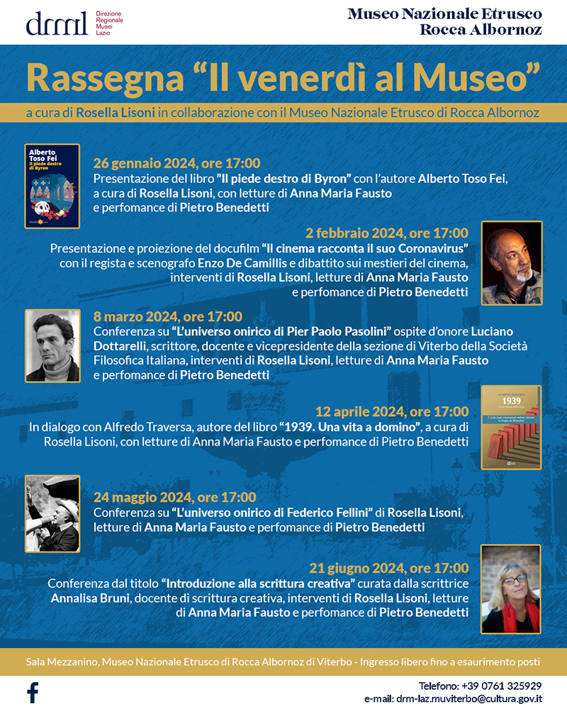 Sarà lo scrittore Antonio Toso Fei, drammaturgo, saggista, giornalista, story teller delle tradizioni veneziane, ad inaugurare la rassegna presentando il suo libro: "Il piede destro di Byron" in dialogo con Rosella Lisoni, venerdì 26 gennaio alle ore 17.00 nella Sala Mezzanino del Museo Nazionale Etrusco di Rocca Albornoz.