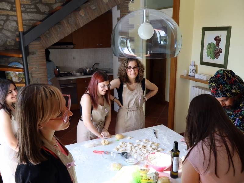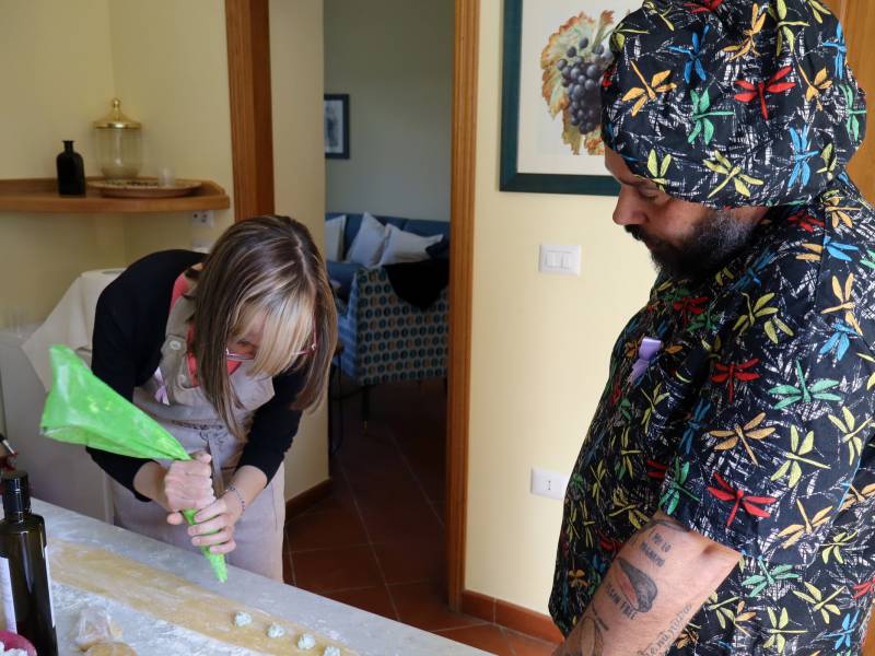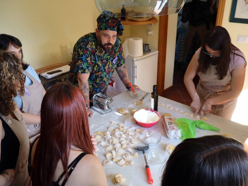 Il pomeriggio è iniziato con un laboratorio di cucina dedicato alla pasta fatta in casa, dove ragazzi e ragazze, sia volontari che persone seguite e supportate dalla Fondazione, sono stati guidati dallo chef Cristiano Sabatini, per preparare dei ravioli ripieni di borragine.