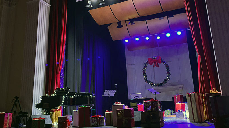 TARQUINIA - Il palco del teatro comunale che si trasforma in un salotto, carico di pacchi regalo e atmosfera natalizia, che la sera di Natale si anima di musica e emozioni, punto di incontro virtuale di una comunità che per sconfiggere la minaccia della pandemia deve rinunciare ad abbracciarsi dal vivo.