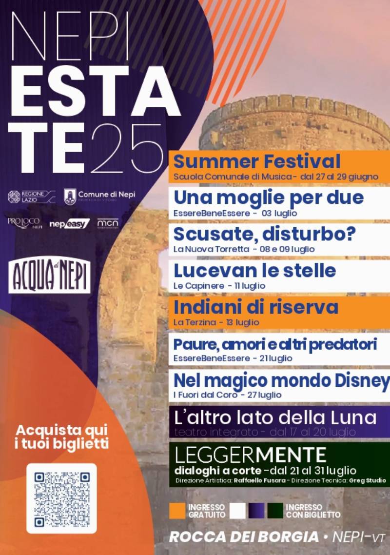 “Si avvicina la stagione estiva e si scaldano non solo le temperature ma anche i motori che ci traineranno in una spettacolare Estate nepesina, per trascorrere insieme le calde serate estive – sono queste le parole del Presidente della Pro Loco di Nepi Fabio Pifferi - Anche quest'anno la parola d'ordine sarà Cultura con la C maiuscola e in varie declinazioni. La cultura che deriva dall'amore per le proprie tradizioni e dal desiderio di mantenerle vive, con il nostro teatro dialettale. La cultura dell'attenzione e dell'integrazione, con gli spettacoli teatrali organizzati dalla Coop Gea, che suscitano sempre partecipazione mista a divertimento, totalmente inclusivi, quest'anno anche in LIS. La cultura dell'educazione musicale e artistica, con serate dedicate alla musica, classica e moderna, e al teatro amatoriale del nostro storico gruppo teatrale nepesino ma anche il concerto di Mario Alberti, musicista e cantautore, con l'ultimo lavoro 'Indiani di Riserva' Inoltre sarà presentata la rassegna 'Legger-Mente Dialoghi di Nepi' dove talk show, incontri pubblici, appuntamenti per il pubblico di parole e pensieri in cui la mente dei personaggi invitati sarà protagonista sul palco leggermente come la nostra acqua.... Tutti gli eventi saranno valorizzati dalla splendida cornice del Forte dei Borgia, che accoglierà tutti coloro che vorranno trascorrere con noi le calde serate estive di luglio, nell'attesa del grande agosto nepesino che culminerà con i festeggiamenti dei nostri Santi Patroni”.