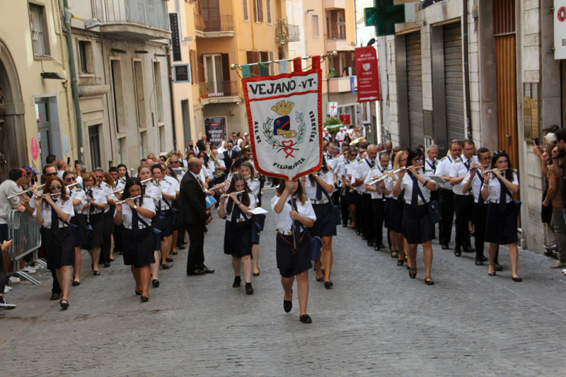Dal teatro viterbese è iniziata la sfilata lungo la città, davanti la Banda di Vejano e il suono "la sera del 3", poi le autorità, il Sodalizio e tutti i Facchini. Un primo abbraccio tra la folla, ancora poca quella presente, che per conquistare la prima fila è comunque giunta già ieri sera e stamani presto, e ricevere la benedizione e il saluto nelle varie chiese, fino al Santuario di Santa Rosa, presente il vescovo, ultima tappa prima della "merenda" al boschetto dei Cappuccini.