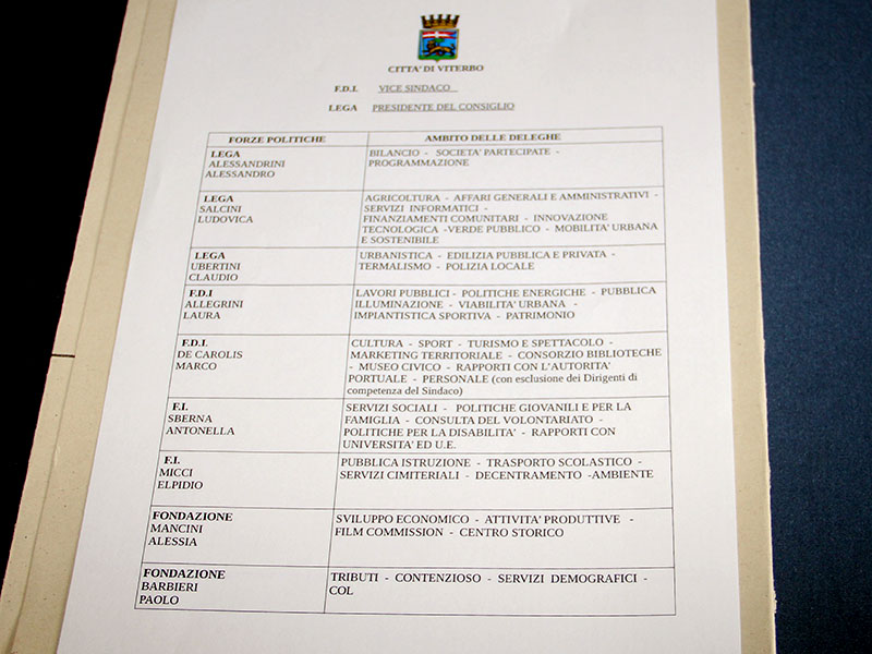 VITERBO - "L'armonizzazione delle deleghe" così l'ha definita stamani il sindaco Arena quella che è, di fatto, la ricomposizione della giunta, con qualche aggiustamento.