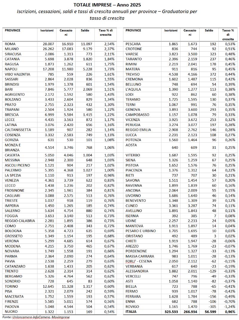 VITERBO - La provincia di Viterbo chiude l’anno 2025 con un saldo positivo di 92 imprese, frutto di 1.687 nuove iscrizioni e 1.595 cessazioni, attestandosi su un tasso di crescita dello 0,25%.