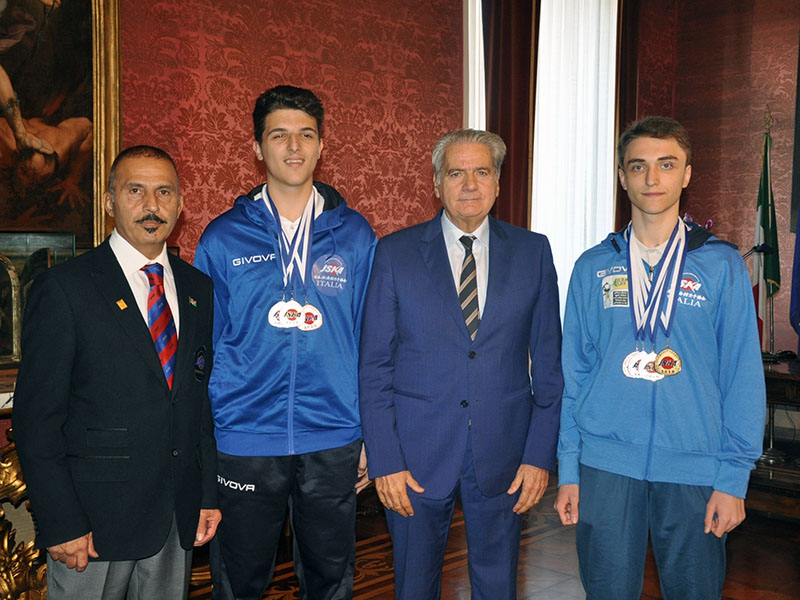 VITERBO - Il sindaco Giovanni Maria Arena ha incontrato i campioni di karate Matteo Plantera e Walter Mastromichele, vincitori di numerose medaglie in occasione del 9° Campionato mondiale di karate, svoltosi allo Zenit Arena di San Pietroburgo, in Russia, dal 28 al 30 settembre.