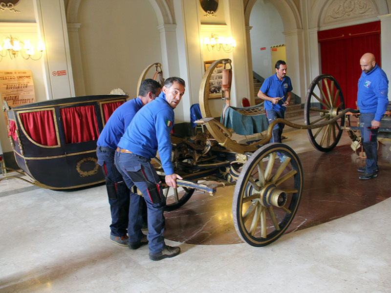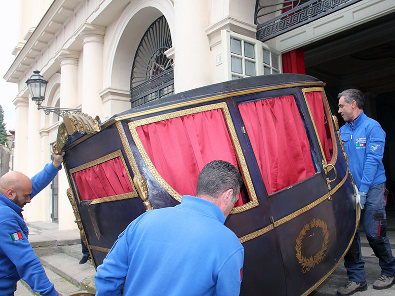 Eccola, è stata prelevata stamani, dalla ditta Grazini Traslochi, la stessa che l'aveva accompagnata nel viaggio di andata, alla presenza del sindaco Arena e dell'assessore Contardo, primo fan della carrozza settecentesca.
