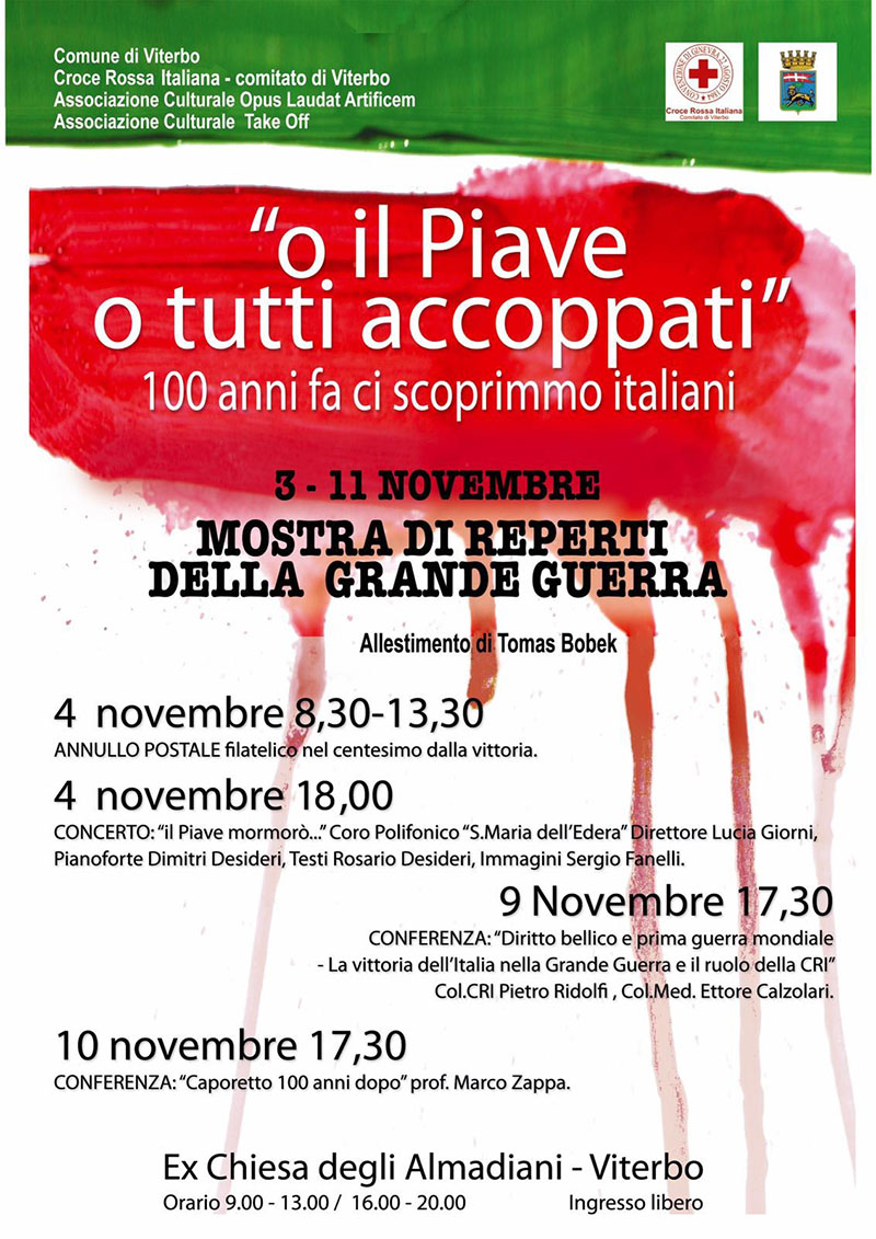 Oggi, cento anni dopo, rimane il ricordo e soprattutto la preghiera per migliaia di morti, da una parte e dall'altra, monito e suprattutto memoria storica per evitare nuovi conflitti. "O il Piave ... o tutti accoppati" è l'accorato appello che è diventato titolo della manifestazione viterbese, organizzata dal Comune, Croce Rossa Italia, comitato di Viterbo, e dalle associazioni Take off e Opus Laudat Artificem, che si svolgerà dal 3 all'11 novembre nella Sala degli Almadiani (piazza Martiri d'Ungheria).