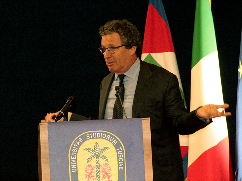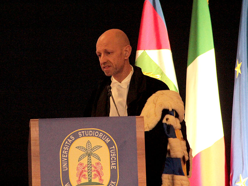 L'apertura della cerimonia al Rettore Ruggieri, che ha subito sottolineato il quarantennale del decreto di apertura dell'Università della Tuscia: “Un territorio fatto di tante piccole e medie aziende, con un sistema di trasporti carente, e nonostante questo è avvenuto un miracolo, merito del primo Rettore, Scarascia Mugnozza, e del secondo, Mancini, e ora il mio lavoro a proseguire il progetto. Mi piace riprendere un argomento, quello della cultura e della competenza; in una classifica di qualche anno fa l'Unitus era la facoltà con maggiori laureati figli di non laureati, segno della sua importanza e della crescita culturale del territorio.