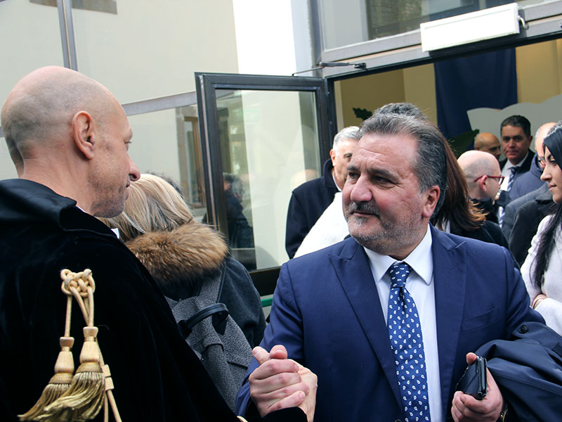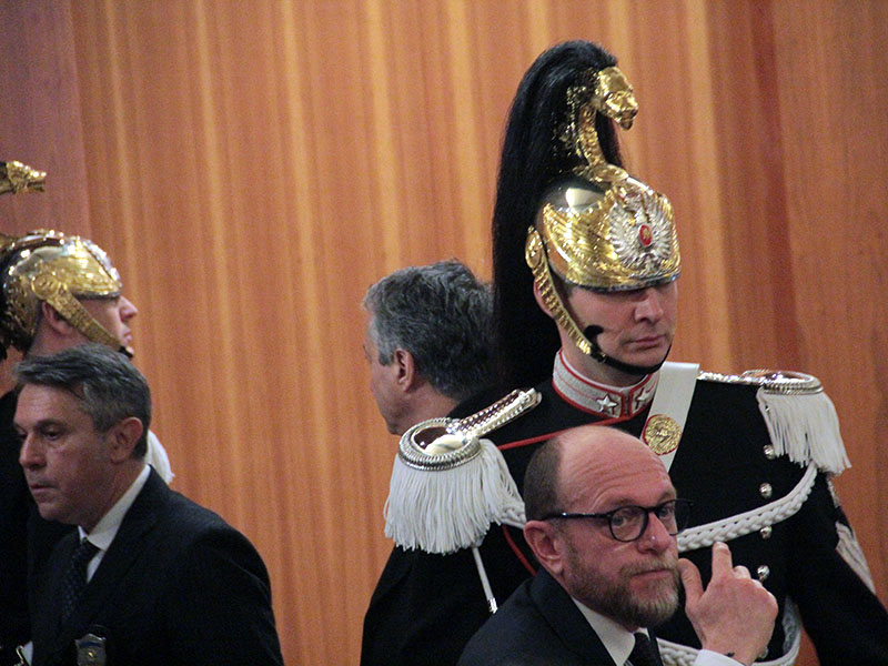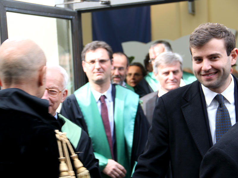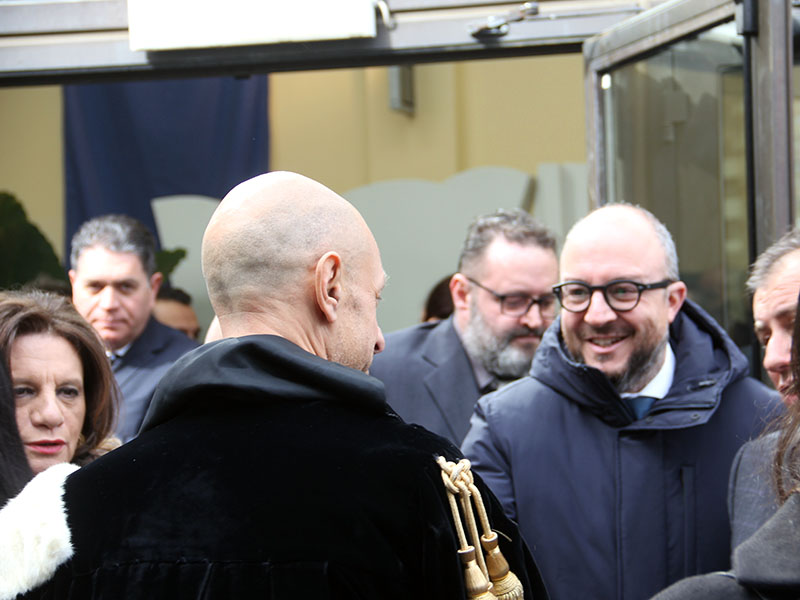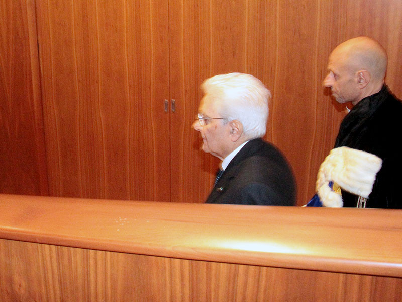 Alle 11.05 l'arrivo in sala accompagnato dal Rettore Ruggieri, un attimo prima l'ingresso di due Corazzieri, e il vice presidente della Corte Costituzionale.