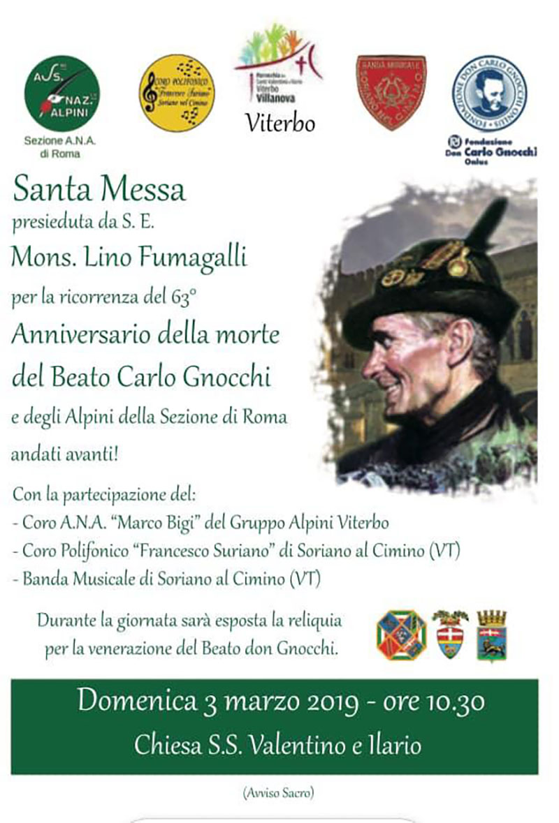 Domenica 3 marzo 2019, nella chiesa dei santi Valentino e Ilario, a Villanova, il gruppo Alpini di Viterbo, sezione di Roma, presieduto dal capogruppo Franco Barillà, invita tutta la cittadinanza alla celebrazione in occasione del 63° anniversario dalla scomparsa terrena di don Carlo.