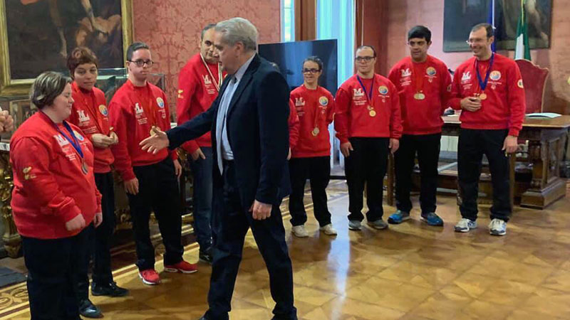 VITERBO - Il sindaco Giovanni Maria Arena ha consegnato un attestato di merito sportivo agli atleti della ASD Sorrisi che nuotano Eta Beta. Il primo cittadino, nei giorni scorsi, si è congratulato con i ragazzi che hanno partecipato ai Giochi nazionali invernali Special Olympics di Bardonecchia dello scorso gennaio, conquistando 8 medaglie d'oro, 5 d'argento e 5 di bronzo.