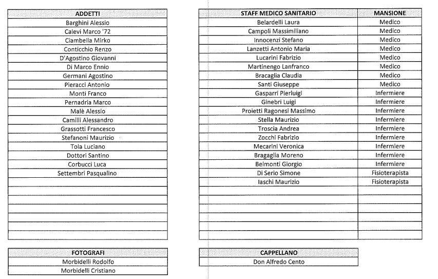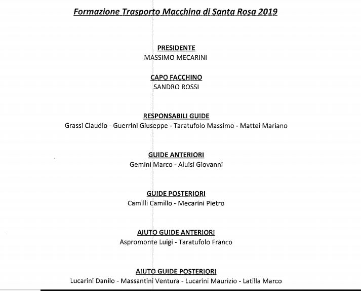 A seguire pubblichiamo il documento ufficiale inviato dal Sodalizio, con tutti i nomi e i rispettivi ruoli, proprio nell'ultima pagina è piacevole notare come nello staff tecnico-medico siano ora tre le donne, le dottoresse Laura Belardelli e Claudia Bracaglia e l'infermiera Veronica Mecarini. Difficilmente arriverà il giorno in cui si potrà vestire la disiva bianco rossa per portare la Macchina, un compito davvero troppo complesso, ma è comunque bello trovare figure femminili all'interno del Sodalizio.
