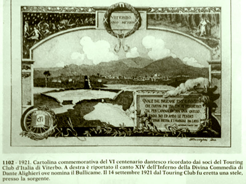 E’ utile ricordare che il primo gruppo consolare Touring venne costituito a Viterbo subito dopo la Grande Guerra. Si ha notizia che nel 1921 i soci di allora presero l’iniziativa di erigere presso la caldera del Bulicame, in occasione del sesto centenario della morte di Dante, un stele con riportati i versi del XIV canto dell’Inferno “Qual del Bulicame esce il ruscello…”.