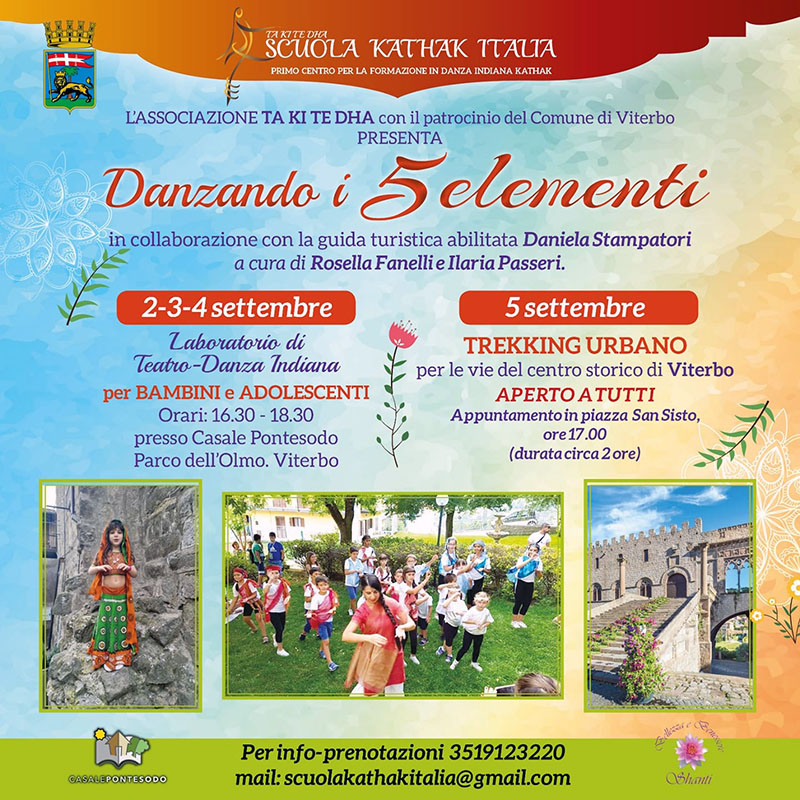 Le lezioni porteranno alla composizione di una breve performance che diventerà parte integrante del Trekking urbano in programma sabato 5 settembre, un percorso nel centro storico di Viterbo, con cinque tappe attinenti ai cinque elementi protagonisti del laboratorio: aria, acqua, fuoco, terra e spazio, scelti da Daniela Stampatori, guida turistica abilitata.