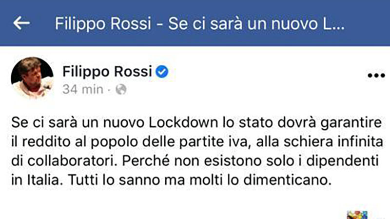 Era già successo nel blocco di primavera, è accaduto ancora: il supporter di Zingaretti, che ha trascorso l'estate fungendo da stampella culturale della Regione nel bel castello incantato sul mare, scarica il boss (che è al governo) e attacca un possibile fermo che rimetterebbe le partite iva in ginocchio, con relativo rimborso economico quale risarcimento statale.