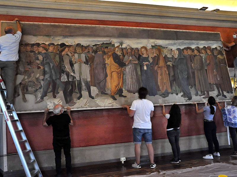 "Lo stato conservativo del dipinto richiedeva un intervento di restauro per le diverse problematiche di degrado in atto - ha spiegato Valentina Fiorito - sia a livello strutturale, come alcune lacerazioni del supporto tessile, che di pellicola pittorica, ovvero difetti di adesione e depositi di sedimentazioni carboniose. Durante le fasi di smontaggio della tela è stato possibile recuperare la dimensione originale del dipinto (210 x 620cm), riscoprendo la firma dell'autore e l'anno 1889. Considerate le ampie dimensioni dell'opera, per ragioni di collocazione all'interno della sala in un tempo imprecisato, l'estremità sinistra era stata ripiegata di 30 centimetri intorno, al di sotto della cornice".