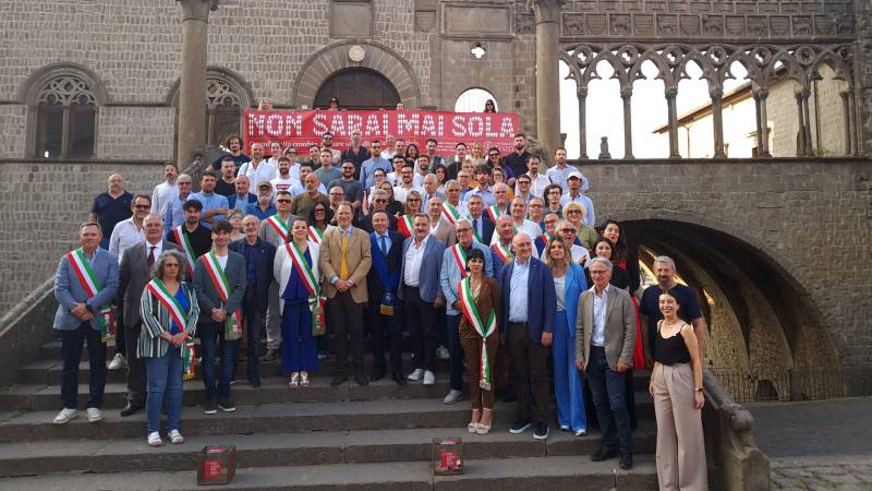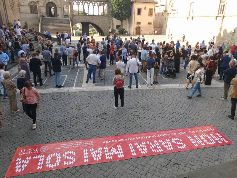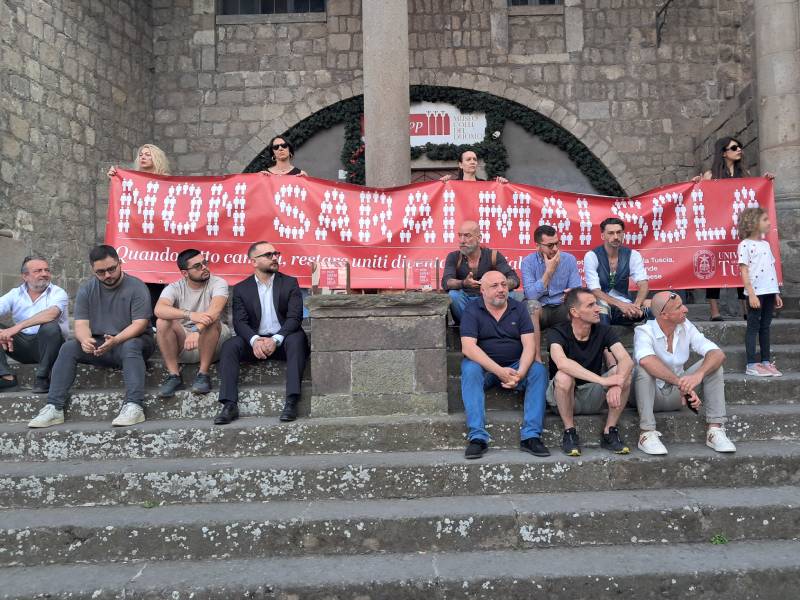 "Non sarai mai sola" è lo slogan scelto, che è stato anche fissato con lo scotch sulla pavimentazione di piazza San Lorenzo dagli studenti dell'accademia di belle arti, e tutti i protagonisti, dall'Università ai ristoratori, dai produttori agricoli ai sindaci, insieme ai consiglieri regionali Zelli e Panunzi e tanti comunali, si sono raccolti sulla scalinata di Palazzo Papale, simbolo di unione cittadina, per una foto.
