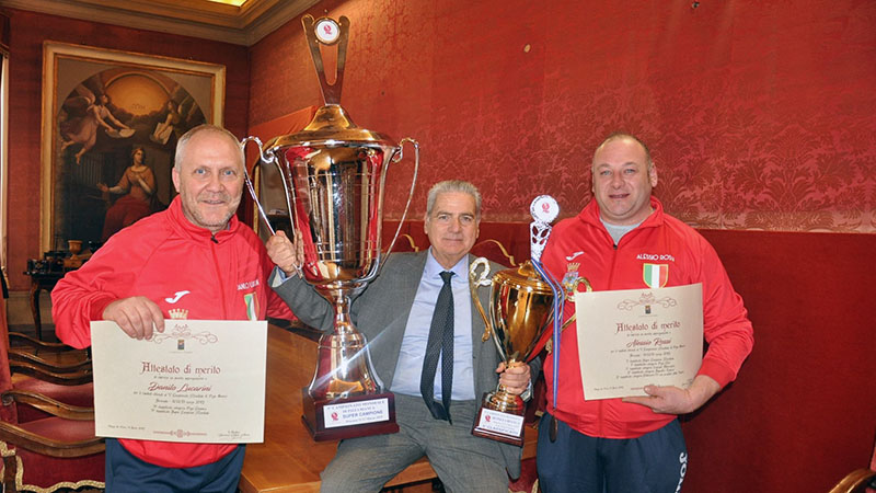 VITERBO - ll sindaco Giovanni Maria Arena ha consegnato nei giorni scorsi un attestato di merito ad Alessio Rossi e a Danilo Lucarini, per gli eccellenti risultati conquistati in occasione del V Campionato mondiale di pizza bianca, tenutosi a Siracusa, dall'11 al 13 marzo.