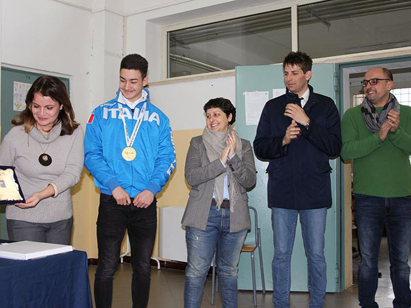 La dirigente scolastica Laura Piroli, i compagni, gli assessori Manuel Catini, Federica Guiducci e l'assessore allo sport Stefano Zacchini, lo hanno accolto con tutti gli onori nell'Aula Magna della sede centrale dell'istituto. Una vera e propria cerimonia a cui hanno assistito commossi i genitori, il fratello, insegnanti, una delegazione nutrita di compagni di vita che Mirko frequenta quando è libero dagli impegni della sua intensa attività agonistica, in giro per il mondo, Indonesia, Giappone, fino in Russia dove è stato acclamato Campione d’Europa nella categoria Kata Junior, grazie alla vittoria in finale contro lo svizzero Yuki Ujihara.