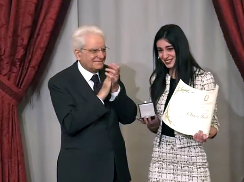 Il Quirinale, l'umanità del presidente, la solennità dell'onoreficenza e si è sciolta, mostrando la sua infinita dolcezza, commuovendosi alla lettura della motivazione: "Studentessa liceale, modella e barista nel periodo estivo. Si è classificata terza al concorso di Miss Italia. Sei anni fa perse parte della gamba sinistra in un incidente stradale, ed è stata la prima a partecipare al concorso con una protesi. E’ stata costretta ad affrontare giudizi denigratori, apparsi sui social. Ha risposto che “una ragazza senza un arto può gareggiare al pari di tutte, che la diversità non è vincolante, che la vita non si interrompe mai ed è sempre bella, anche quando sembra che ce l’abbia con te, che da un dramma si rinasce e si cresce più forti di prima. Tutto sta nel saper reagire”.