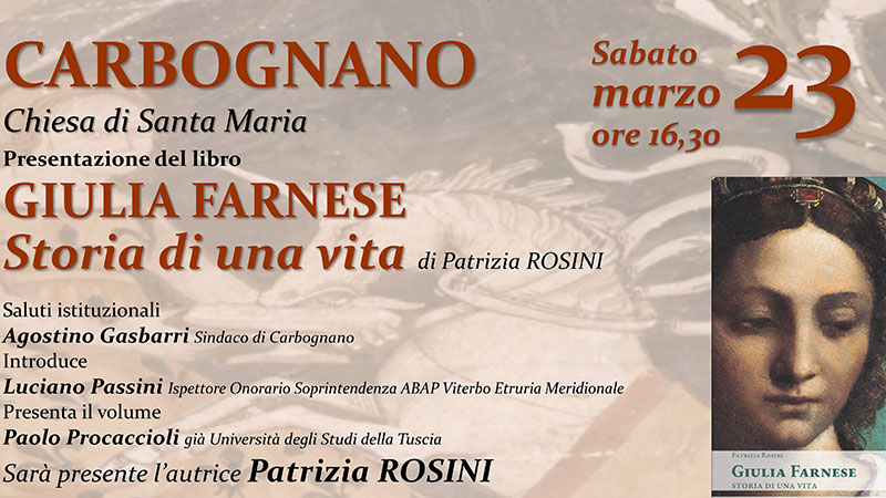 Il pomeriggio l’iniziativa si trasferirà nella Chiesa di Santa Maria dove alle ore 16,30 verrà presentato il libro inedito “GIULIA FARNESE” Storia di una vita scritto da Patrizia Rosini.