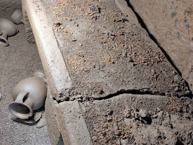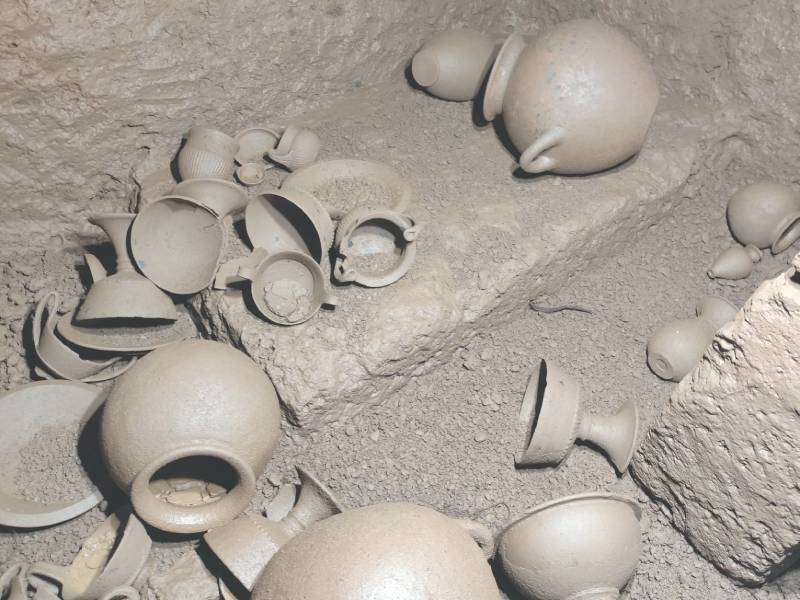 Dopo la rimozione della lastra che chiudeva la camera funeraria, sono stati trovati numerosi vasi ceramici, tra cui pezzi di ceramica fine dipinta etrusco-geometrica. Alcuni di questi vasi sono disposti in modo preciso, in linea con pratiche rituali legate alla sepoltura. Sul letto funebre di sinistra sono ancora in posto un bacile e ornamenti di bronzo che decoravano il defunto, offrendo uno spunto unico per gli studiosi che stanno documentando il ritrovamento.