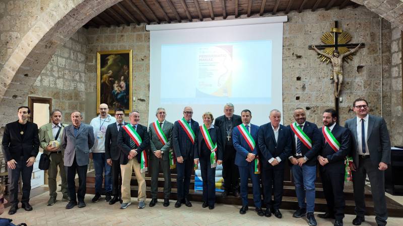 CIVITA CASTELLANA - Gli uffici della curia, presente il padrone di casa Mons. Marco Salvi, hanno accolto l'atto costitutivo del percorso della Via Lauretana, con le firme dei sindaci interessati dal percoso, nel tratto laziale della via di pellegrinaggio mariano che collega Loreto a Roma (leggi anche Peregrinatio Mariae: le tappe da Otricoli a Civita Castellana).