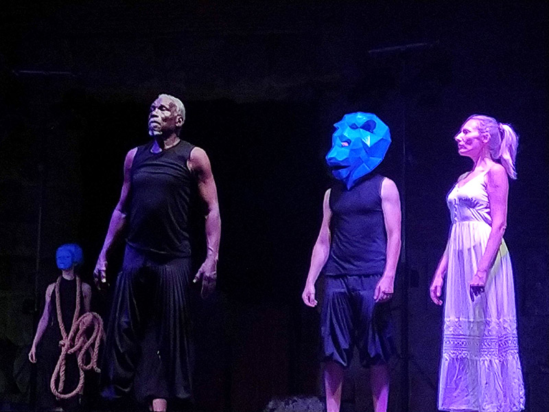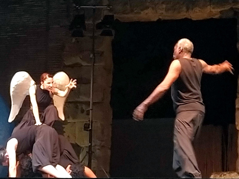 Del dramma greco resta intatto il viaggio psicologico nel dolore, quello della fine verso gli inferi, della violenza, del tradimento anche tra fratelli, delle scelte sbagliate senza ritorno. Sul palco, ovviamente minimal, tre ballerini e una ballerina interpretano con il linguaggio del corpo le vicende del protagonista, che sono raccontate esclusivamente dalla narrazione esterna, nel duale gioco dell'essere protagonisti e, talvolta, compagnia di fila, quando accolgono due attori che interpretano Edipo e la figlia, con la preformance straordinaria di Mamadou Dioume, calato perfettamente nel ruolo dello straniero in terra straniera.