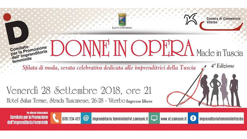 VITERBO - C’è grande attesa per la quarta edizione di “Donne in opera”, la serata celebrativa organizzata dal Comitato per la Promozione dell’Imprenditoria Femminile della Camera di Commercio Viterbo, con il patrocinio del Comune di Viterbo. L’appuntamento è per domani, venerdì 28 settembre a partire alle ore 21, al Terme Salus Hotel, Strada Tuscanese 26.