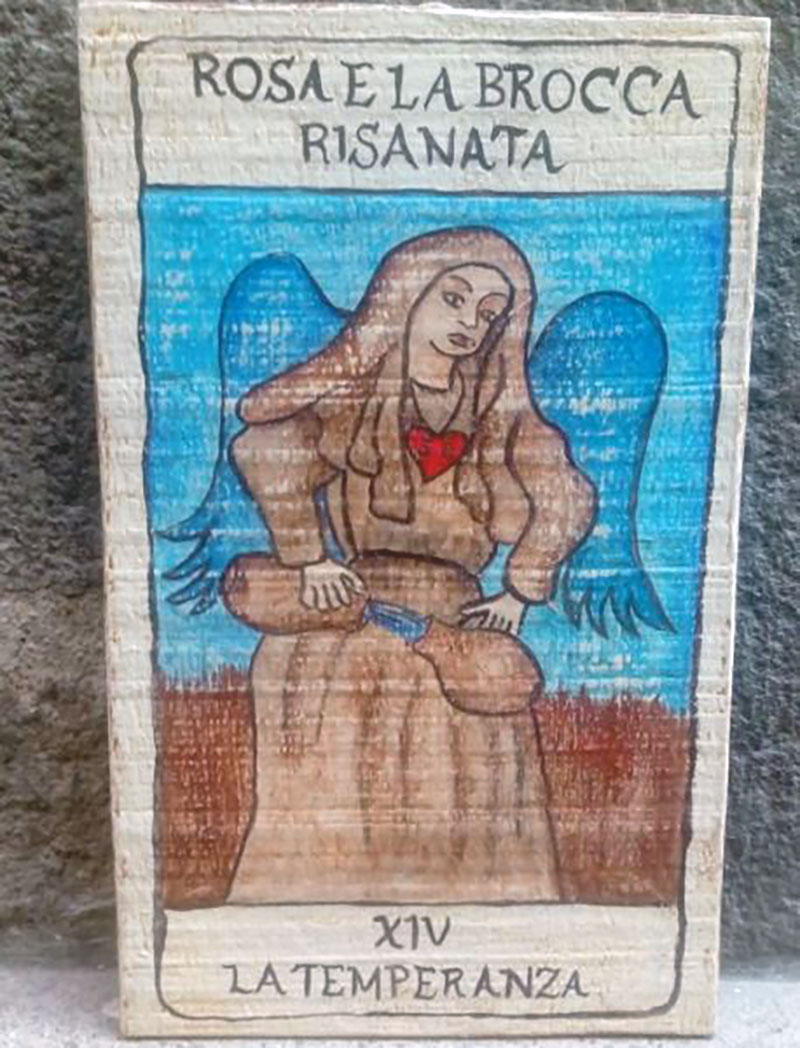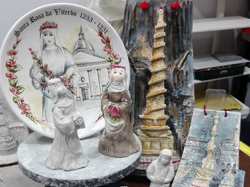 Non c’è solo il palato, però. E in questa “città di antica ed affermata tradizione ceramica” le botteghe artigiane non potevano non onorare la Santa con pregevoli ceramiche, pezzi unici nel loro genere. Arricchiti di grigio in rilievo che ricorda sia il peperino locale, sia il saio di Rosa, nel caso di Cinzia Chiulli Percorsi Artistici (in via San Pellegrino). Chiulli ha realizzato anche due splendidi tarocchi: “La Temperanza”, con l’angelo che travasa da un’anfora a un’altra l’acqua della vita, è associata al miracolo della brocca risanata presso la fonte di Santa Maria in Poggio; “L’Imperatrice”, che mostra una donna coronata dallo sguardo impassibile ma sereno, richiama la giovane Rosa che non esita a sfidare Federico II.