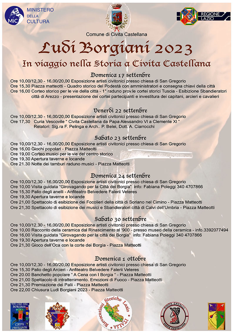 La manifestazione ha anche ottenuto un finanziamento dal Ministero della Cultura nell’ambito del bando per le rievocazioni storiche - aggiunge Coletta - e questo certamente è uno stimolo a fare sempre di più e a farlo meglio. Vorrei ringraziare tutte le associazioni che ogni anno si rendono disponibili mettendo a disposizione il loro tempo, la loro passione, il loro cuore. E poi tutti i figuranti di Civita Castellana e dei comuni limitrofi, gli sbandieratori di Arezzo, il presidente regionale dell’associazione Cortei Storici Antonio Tempesta, il presidente Pietro Pistola, la coordinatrice Cristiana Pistola e tutte le altre tantissime