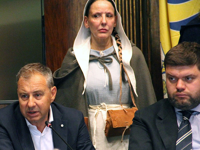 La conferenza si è conclusa con una breve messa in scena de La contesa che ha visto protagonista Enrico di Cornovaglia, figlio di Riccardo, re di Germania, imperatore designato e nipote di re Enrico III d'Inghilterra, che fu trucidato nella Chiesa di San Silvestro, secondo la tradizione popolare al momento dell'elevazione dell'Ostia, da Guido di Montfort.