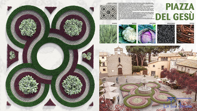 Andiamo ad analizzare piazza del Gesù, in questo caso l'ispirazione nasce dal pavimento cosmatesco della cattedrale di San Lorenzo, che sarà ripreso anche nella piazza dedicata. Un allestimento della grandezza di 18 metri per 18, a far da contorno alla fontana e la realizzazione prende spunto dagli impianti floreali effimeri a sfondo religioso, senza fiori, con lo straordinario utilizzo di rosmarino, broccolo, cavolo rosso e ghiaia di basalto, oltre alla struttura intrecciata alla base.