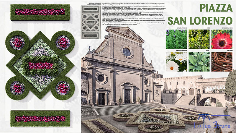 Il percorso naturale prosegue poi in piazza san Lorenzo, sempre ispirata dal pavimento cosmatesco, che si trova proprio in Duomo, di cui si va a ricostruire un'intera porzione rettangolare. Marmo, granito e ceramica si svilupperanno in un tripudio di colori, con protagoniste lavanda stoechas, mirto, dimorfoteca rossa, dimorfoteca bianca, salvia, tutto raccolto nella struttura in legno intrecciato.