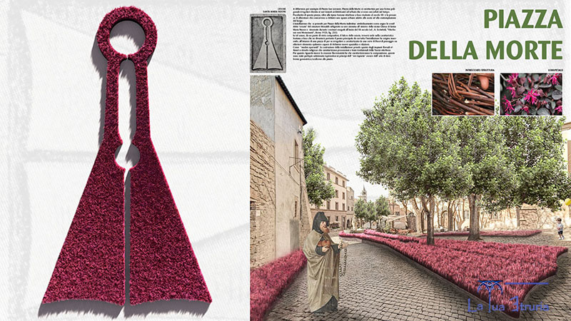 Si proseguirà poi in piazza della Morte, l'unica con monocrotamica con relativo fiore singolo utilizzato. Lungo l'alberata che costeggia la via sarà ricostruita l'immagine delle cesoie presenti in Santa Maria Nuova, quelle del cimatore Monaldi raffigurate su uno stemma, che saranno riportate a pavimento partendo dalla fontana a fuso con l'utilizzo di loropetano, sempre vincolato dall'intrecciato che forma la struttura.