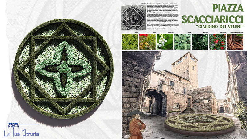Infine piazza Scacciaricci, la più piccola, dedicata al "giardino dei veleni", quelle piante officinali che non mancavano mai nelle farmacie dei conventi, con un decoro da una transenna della cattedrale di San Lorenzo, dove dominerà il verde di bosso, tasso. mughetto, salvia, assensio e agrifoglio, inglobati nel disegno circolare della struttura intrecciata.