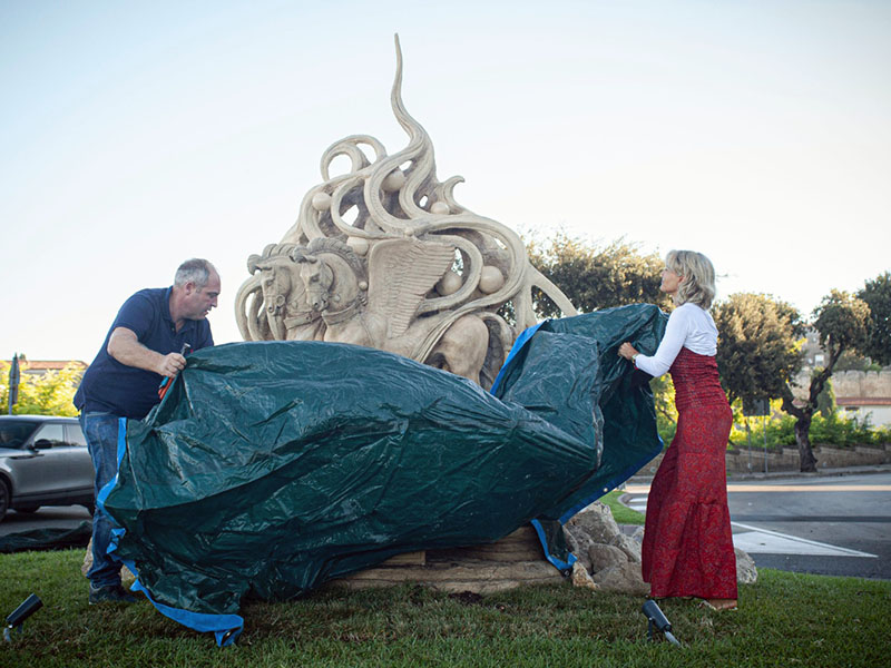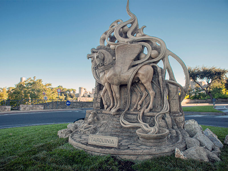 Patrizio Zanazzo l’artista, incaricato di realizzare un’opera da porre all’ingresso alla città, che esprimesse l’identità di Tarquinia, ha scelto i cavalli alati, simbolo della città e richiamo alla civiltà etrusca.