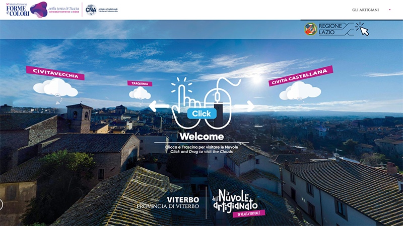 Il prodotto informatico "Le nuvole dell'artigianato" è stato realizzato dall'azienda tarquiniese Skylab Studios, come ha raccontato Leonardo Tosoni: "La nostra visione è ampia, l'idea è portare il patrimonio artistico a tutto il mondo. Con le riprese VR abbiamo realizzato scatti con i droni, cosa che ci ha permesso di simulare la discesa fino ad arrivare dentro i laboratori. La mappa mostra la città, si parte da Viterbo e dalle nuvole nel cielo è possibile scegliere una città diversa e gli artigiani coinvolti, di cui si può apprezzare la grande capacità creativa, entrando proprio nel laboratorio. Inoltre, per ringraziare la Regione per l'impegno, è stata aperta una stanza dedicata, dove è inserito tutto il materiale informativo e i progetti realizzati e in corso, come i bandi. Navigando si noterà come sia uno strumento altamente accessibile - ha concluso Tosoni - e anche strumento di promozione per gli artigiani, che avranno il proprio QR code, un vero biglietto da visita virtuale".