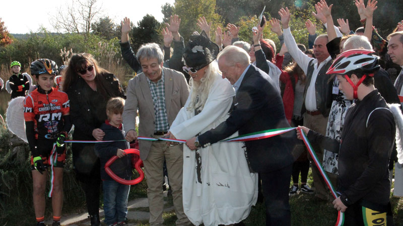 Al loro fianco l'opera scolpita da Gelsomino Casula, nata dal peperino donato dall'azienda Santafiora, posizionata direttamente sulla terrazza che domina il biolago al Parco, benedetta e omaggiata con il taglio del nastro, presenti il sindaco di Soriano, Fabio Menicacci, e l'assessore alla cultura del comune di Viterbo, Antonio Delli Iaconi. Testimonial d'eccezione il maestro Roberto Joppolo che ha incontrato il collega scultore davanti l'opera appena realizzata.