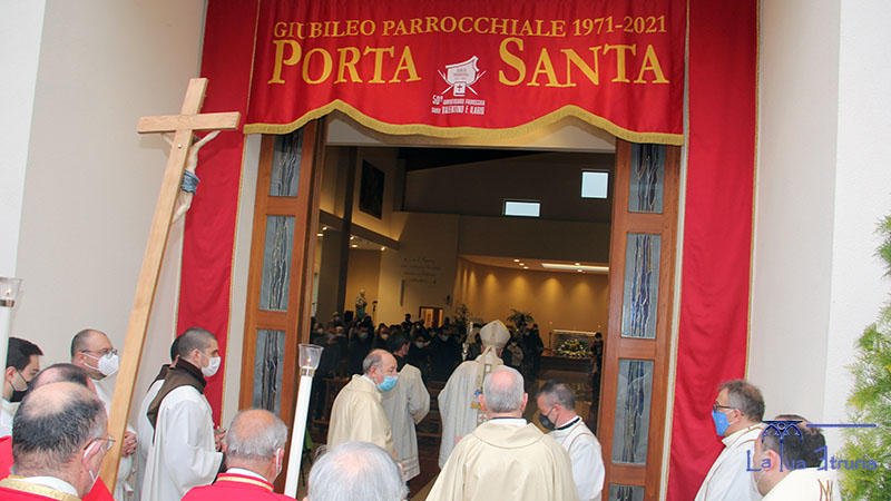 VITERBO - Aperta la Porta Santa per i festeggiamenti del 50° anniversario dell'istituzione della parrocchia nel quartiere Villanova. Il vescovo Fumagalli ha benedetto, aperto la porta e poi celebrato la messa, davanti alle reliquie dei martiri Santi Ilario e Valentino.