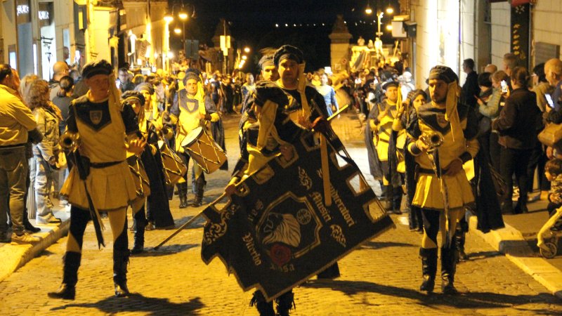 A sfilare con musici, tamburini, sbandieratori, popolani, dame e soprattutto cavalieri, compreso il fantino con lancia, sono state le contrade di San Martino, Santa Lucia, Santa Margherita, Sant'Antonio, Santa Maria in Castello, Madonna di Valverde e San Pancrazio. Ad aprire la manifestazione sbandieratori e dei musici Santa Rosa da Viterbo, che al termine si sono esibiti in piazza (in gallery tutte le altre foto).