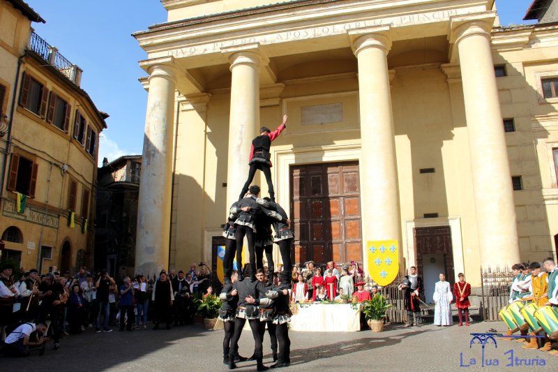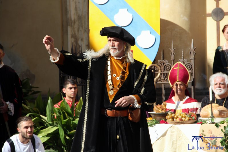 Davanti ad un numeroso pubblico, al suono dei tamburini e delle chiarine, i due promessi sposi si sono uniti in matrimonio, passando poi in corteo, insieme ai tanti figuranti, lungo il corso che porta davanti al castello di Giulia Farnese, dove si è svolto il banchetto (sfoglia le foto nella gallery in alto).
