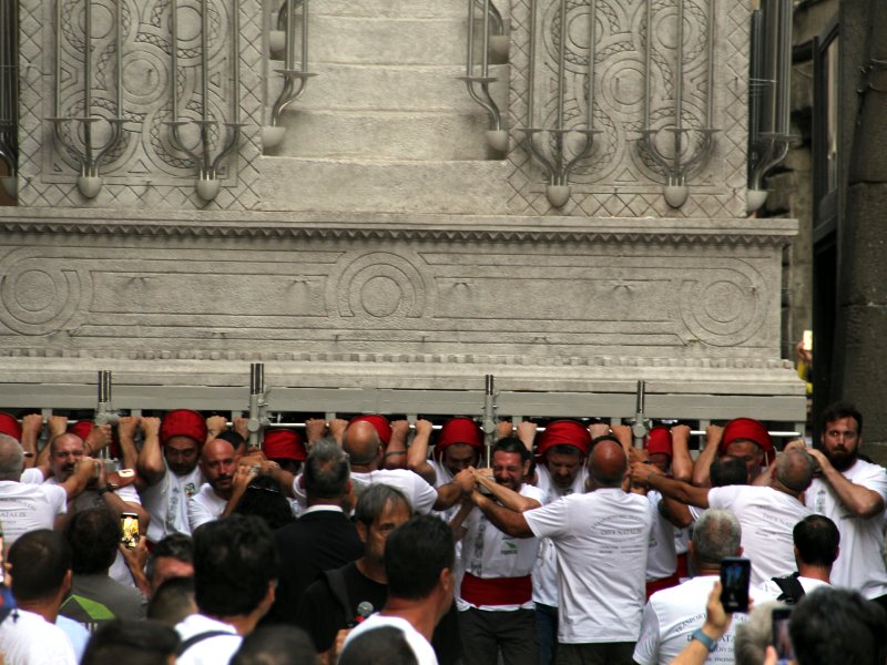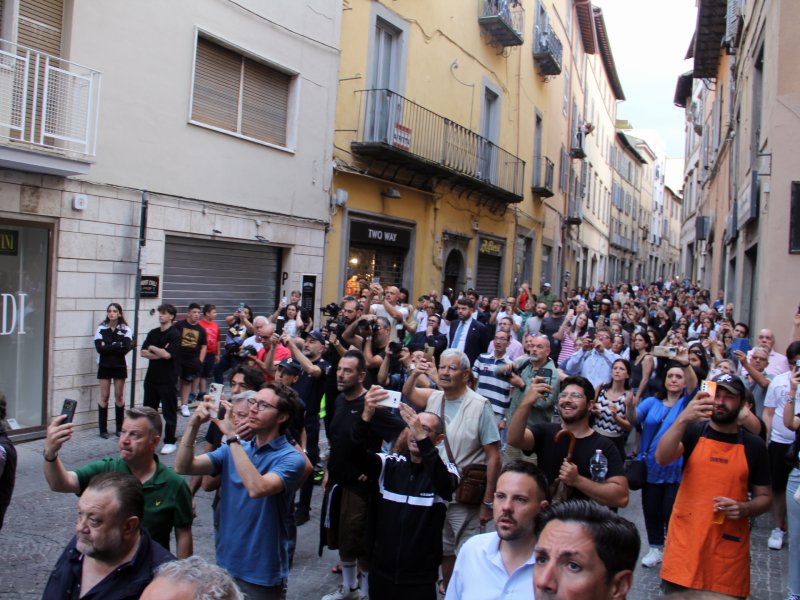 I balconi sono già pieni di viterbesi curiosi, e una volta per tutte ricordiamo che allungare le mani per toccare la Macchina non è solo inutile ma dannoso, e stamani l'unico che ci ha provato porterà con se il grido del capofacchino per molto. Lungo il percorso tantissima gente, alcuni turisti increduli nel comprendere come abbiano centrato proprio questa giornata unica per Viterbo.