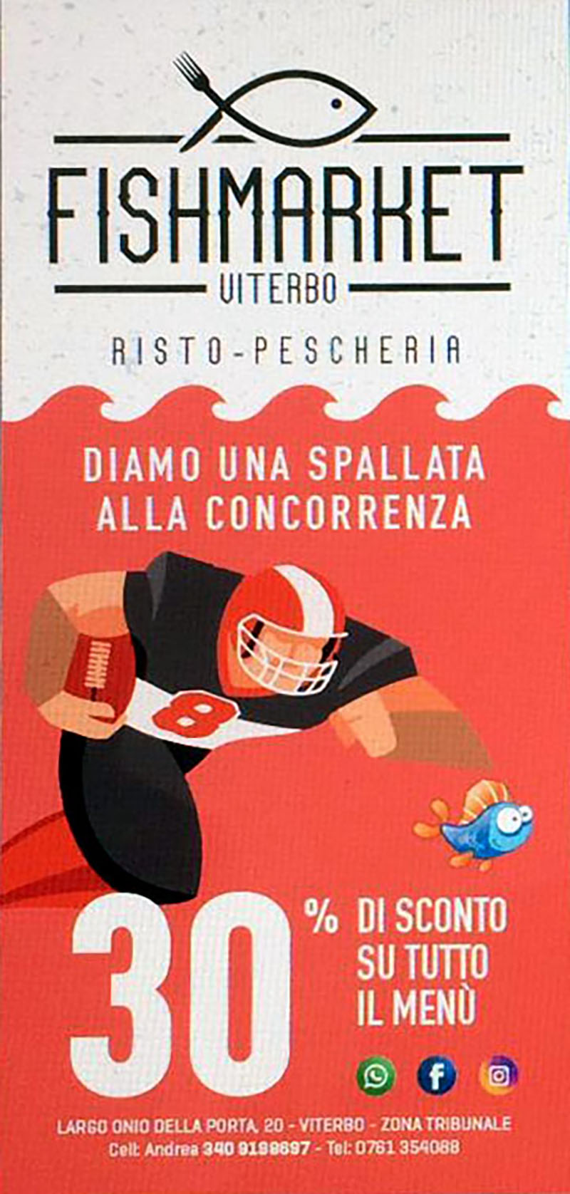 Mesi di lavoro intenso, con una crescita continua che ha portato ad una incredibile fidelizzazione del cliente, ormai praticamente amico. Forti del successo, dimostrato dall'affluenza al locale sia per pranzi di lavoro che per cene con amici e ricorrenze speciali, la gestione del Fishmarket lancia una proposta irrinunciabile: da sabato 1° giugno 2019 inizia l'operazione “Diamo una spallata alla concorrenza”, con un eccezionale sconto del 30% su tutto il menù, sia gustato al tavolo del ristorante, che da asporto, cucinato o fresco che sia.