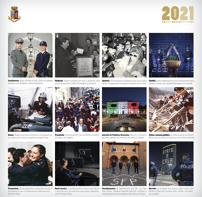Le 12 immagini del calendario, scattate da vari fotografi e in epoche diverse, sintetizzano i 40 anni di storia iniziata nel 1981, anno della legge numero 121 che ha riconosciuto nella Polizia di Stato la prima forza di polizia civile ad ordinamento speciale e delineato il sistema della Pubblica Sicurezza in Italia.