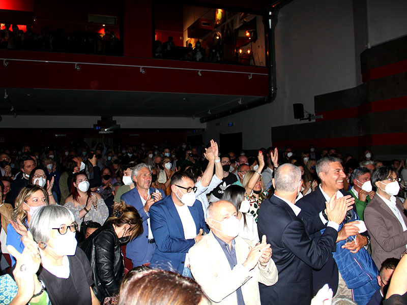 Si parte dal momento più buio, la sconfitta al ballottaggio del 2018, con il video che trasuda ancora amarezza, mentre in platea scende il buio. Chiara Frontini sale sul palco e la sua gente si scatena con l'applauso fino alla standing ovation.